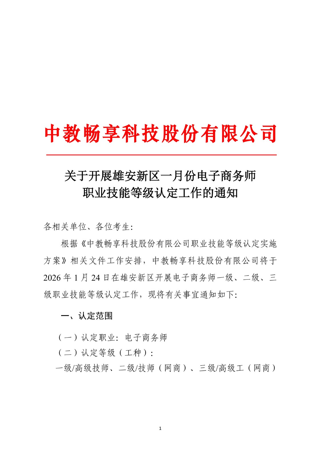 关于开展雄安新区一月份电子商务师职业技能等级认定工作的通知